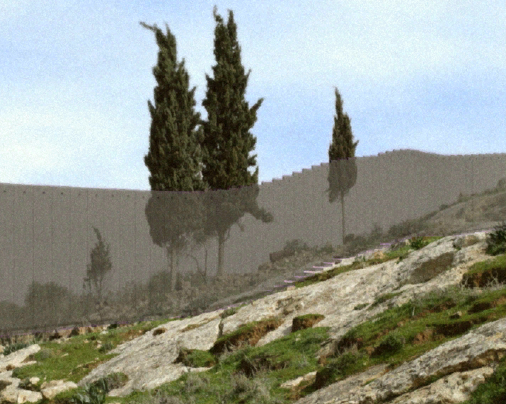 A fresco unfolds in front of our eyes to the sound of construction work, omnipresent but distant, being carried out. This painting represents a Mediterranean kind of landscape. We can make out, in particular, three objects: a cactus, cypress, and an olive tree. The camera sweeps in a curve over the animation bench, revealing the fresco, then freezes. Heaps of fallen rocks have strewn the route, although we haven’t really noticed them. But now we discover what caused these rocks to fall: an olive branch has broken through a wall. This wall is the one separating Israel and Palestine.