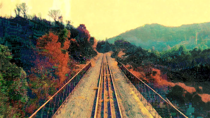 A few kilometers away from Ajaccio, the burned soil gives in under the weight of the color. The ground splits and releases pictorial energies which seize the sky. I see the horizon disappearing, but I fix it. The train continues its road.