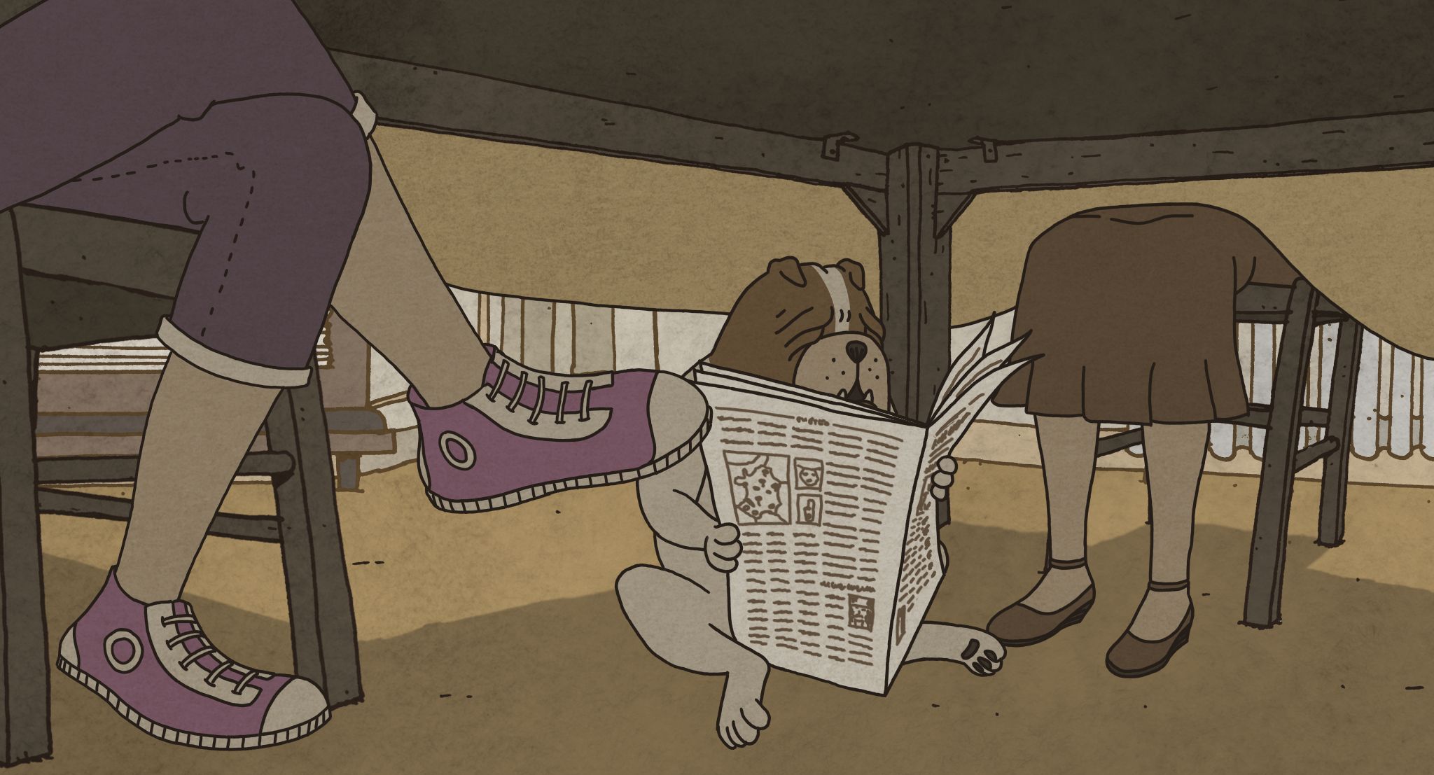 This evening, the dog Fifi is forced to read his newspaper under the table at meal time. But between Dad, Mom, Thomas and Zoé, the atmosphere is electric, they all do as they please and the reading is fastly compromised.