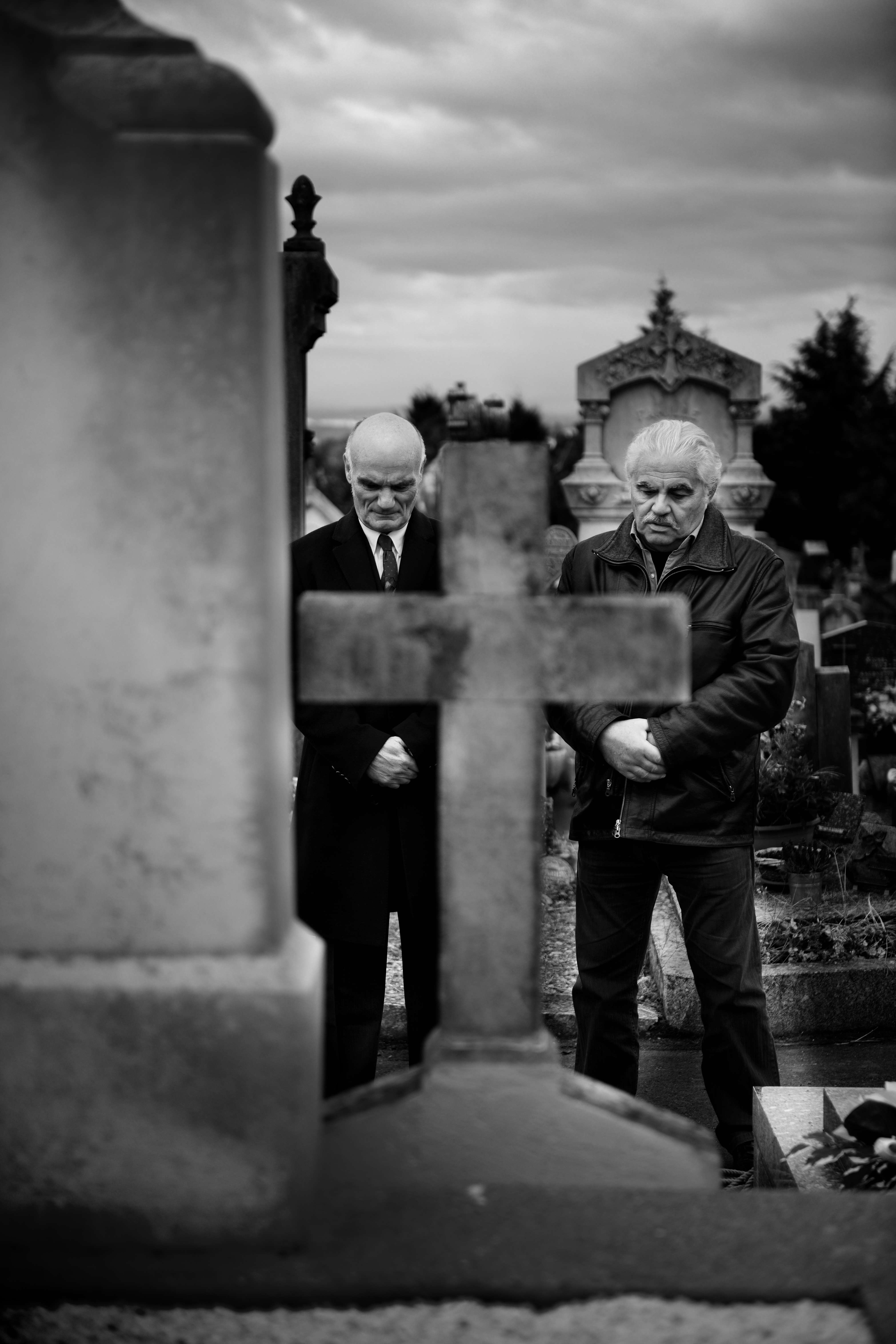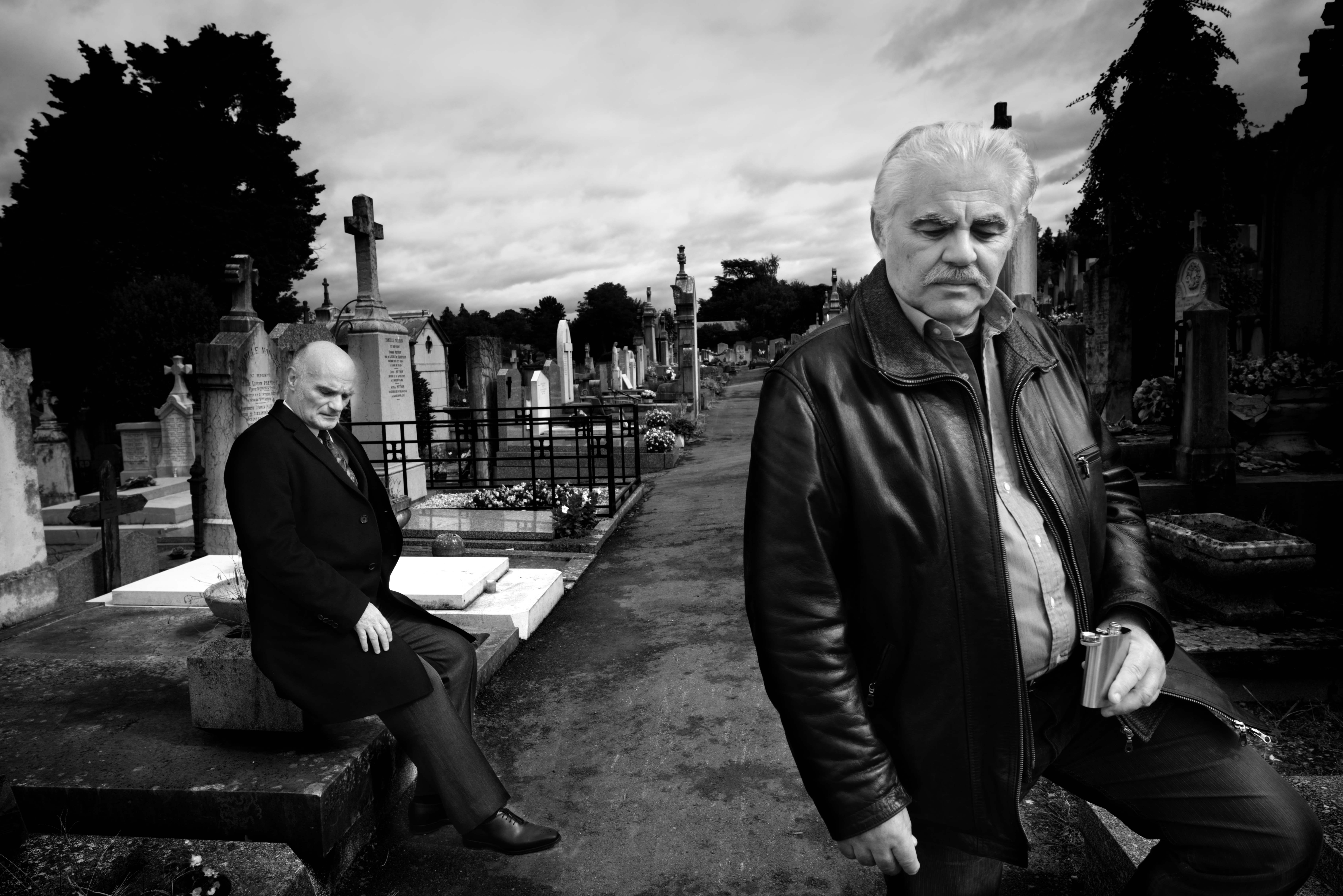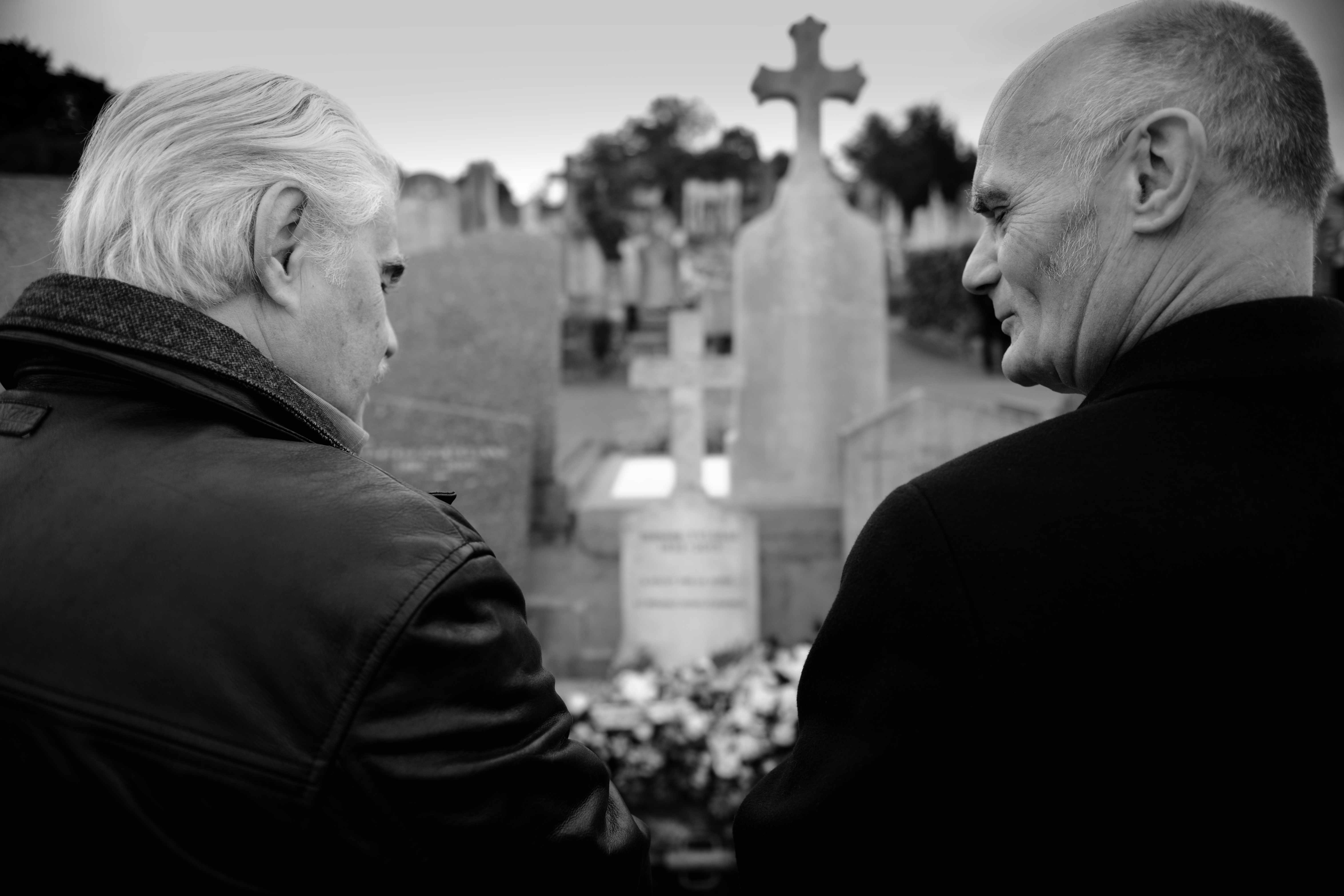 It is the end of a burial, people slowly leave. Two people stay by the grave. They talk of the person passed away, remembering, memories and anecdotes. They talk of life and dearh.