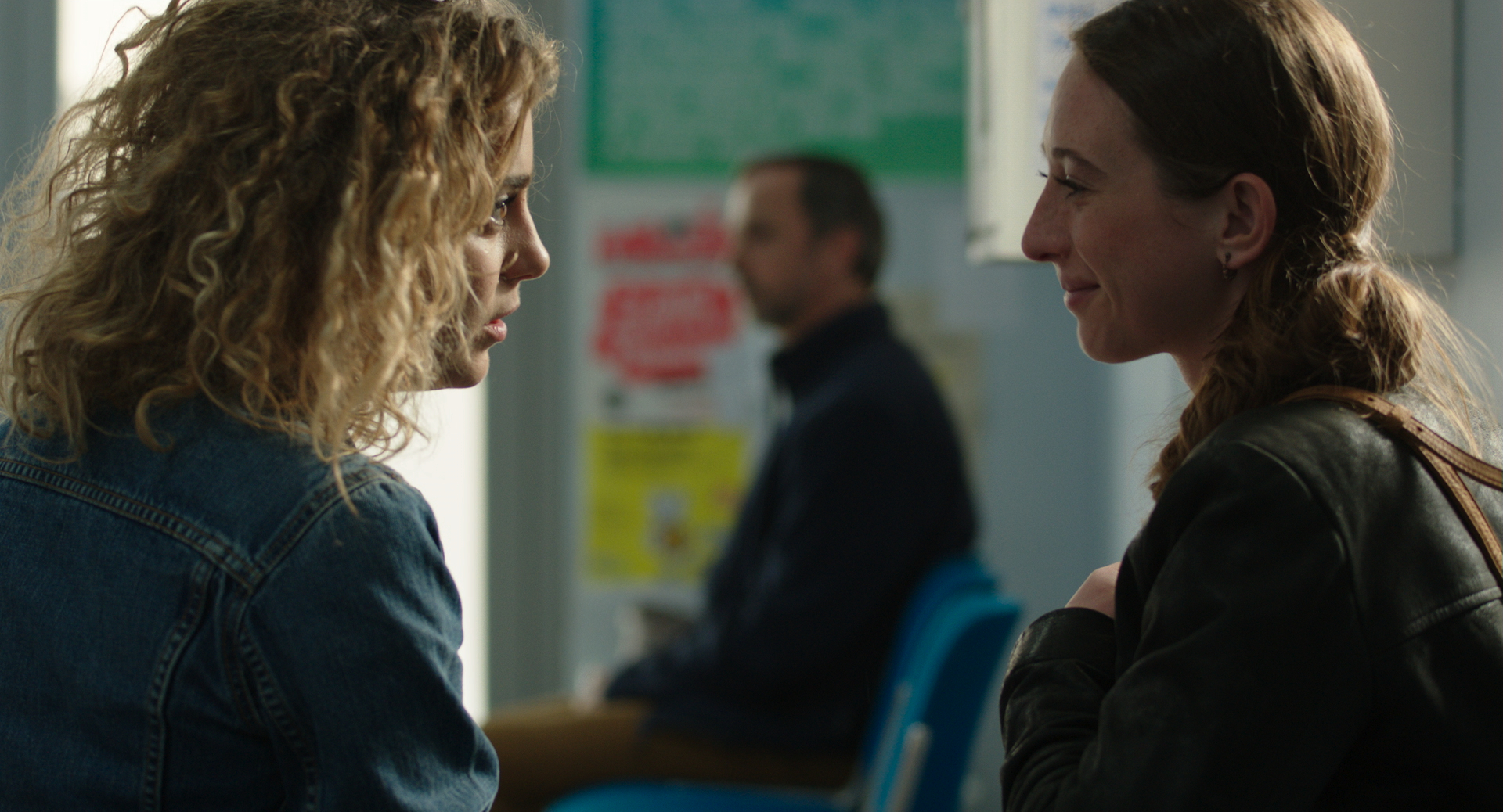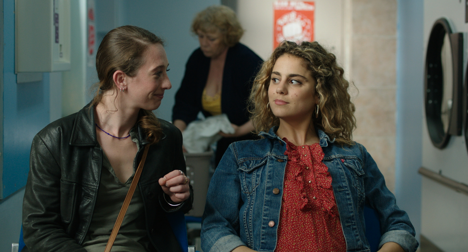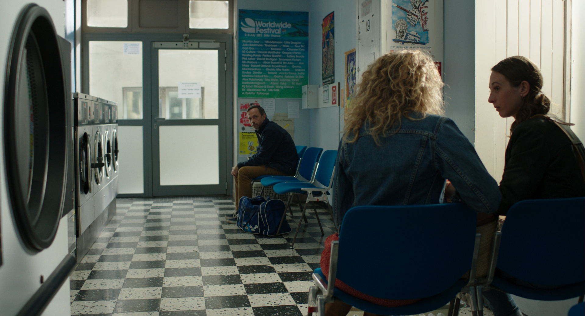 In a Laundromat, a man, whose focus appears to be elsewhere, listens in on two women who share their secrets. But various outside noises prevent him from hearing the most interesting bits of the women's conversation.