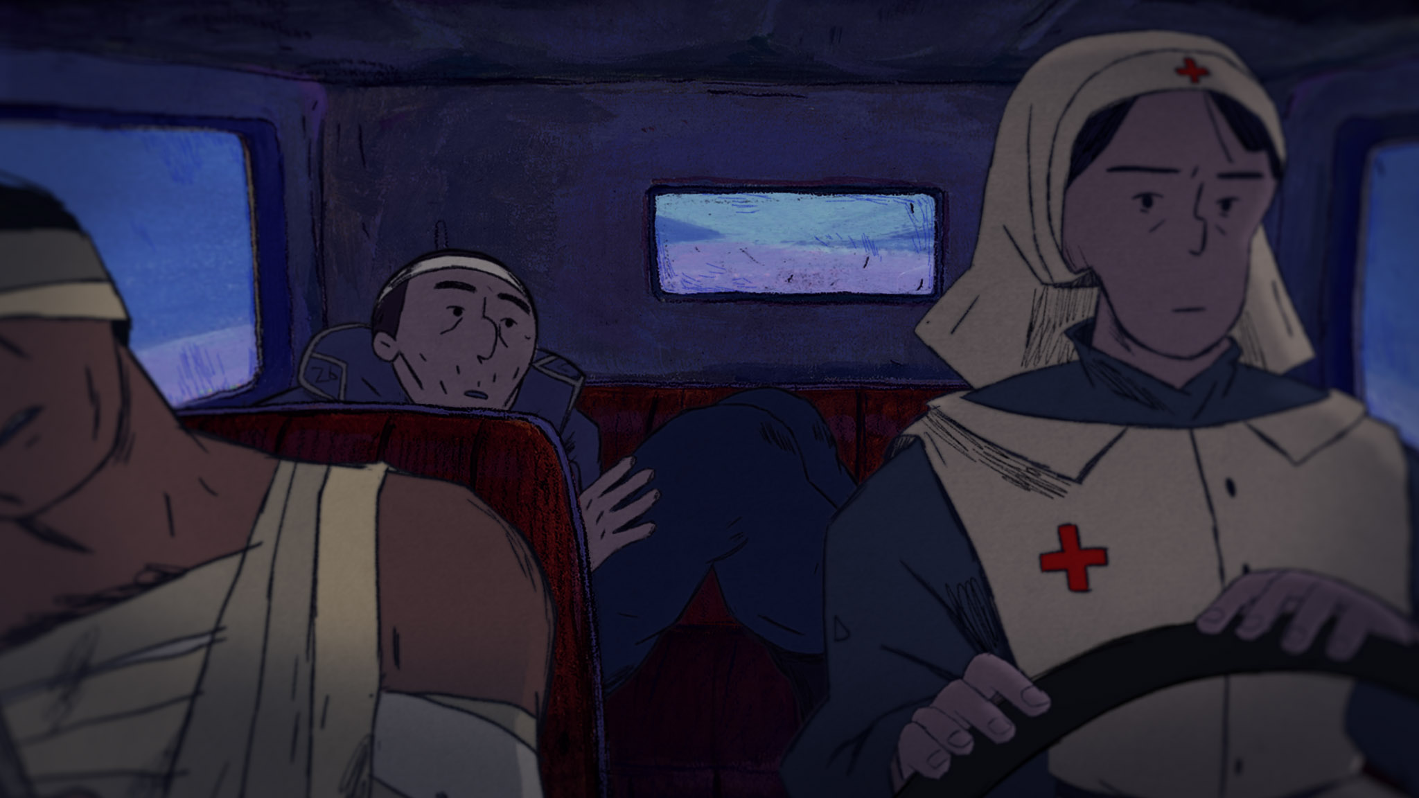 An injured soldier is transported in the back of an ambulance. Under the light of a distress flare, his journey turns into a chaotic one.