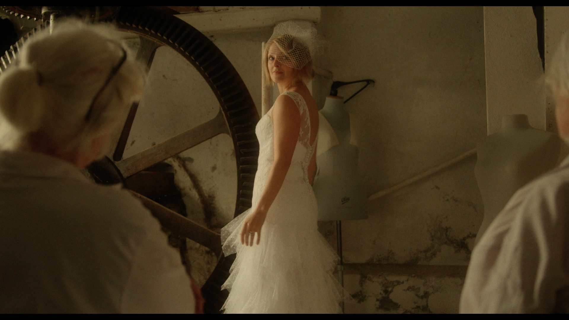 In their former workshop, Évelyne and Chantal make and sell wedding dresses for cash in hand. While Évelyne makes a delivery, Chantal receives a new client. The fitting is disturbed when a real estate agent visits the premises. Évelyne, Chantal, and their client must hide.