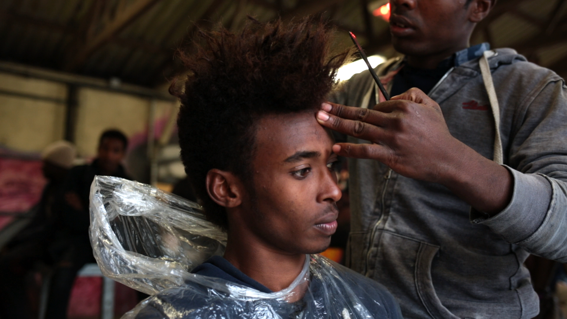 Surrendering to razors and scissors, Emran, Gadisa, and Maher have their hair cut and their beards trimmed. Sitting in front of a mirror, their thoughts drift between memories of their homeland and the tragic events that brought them here, to the Calais Jungle. As their faces lighten up, they patiently contemplate their present lives and what the future holds. With the Jungle soon to be dismantled and a new chapter in their lives about to begin, this film questions the image that we have in Europe of migrants.