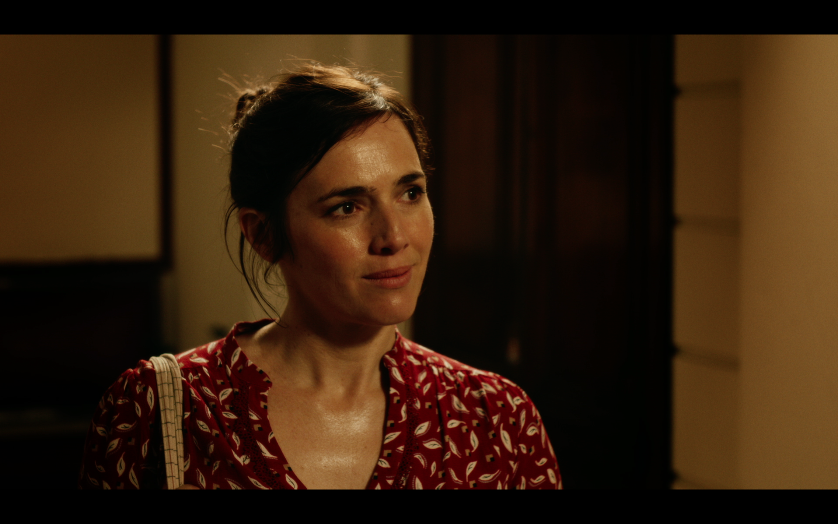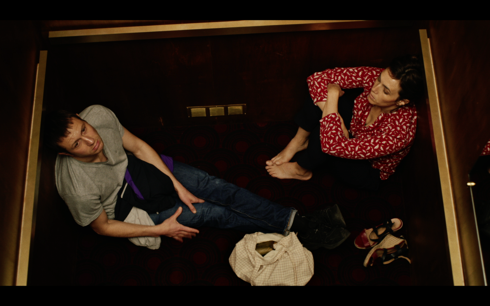 Samuel and Agnes are blocked in an elevator just after Agnes has stolen Samuel's bag. In this enclosed space with no exit, the attacker and victim confront each other, before finally letting their masks drop.