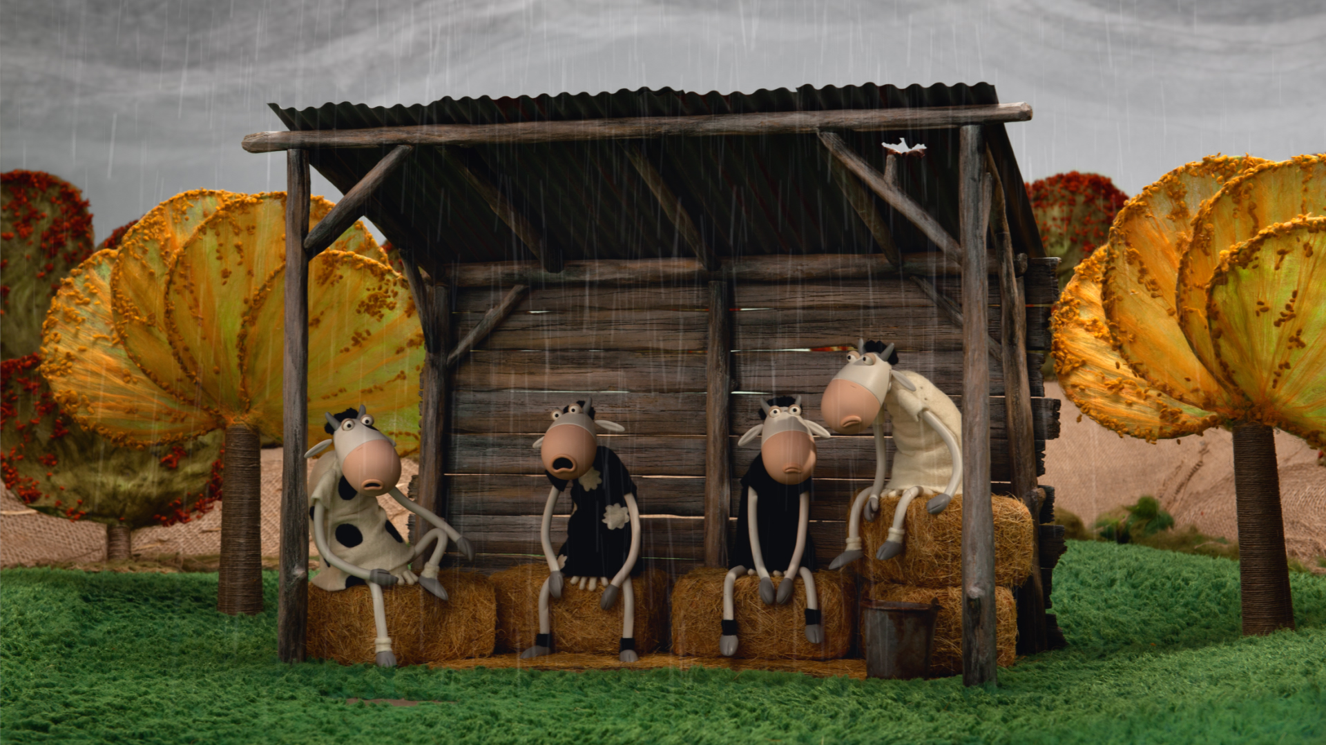 Marguerite, Aglaé, Clarisse and Rosine are huddled together under the shelter and are angry at the bad weather. When it rains, it's impossible to have fun!