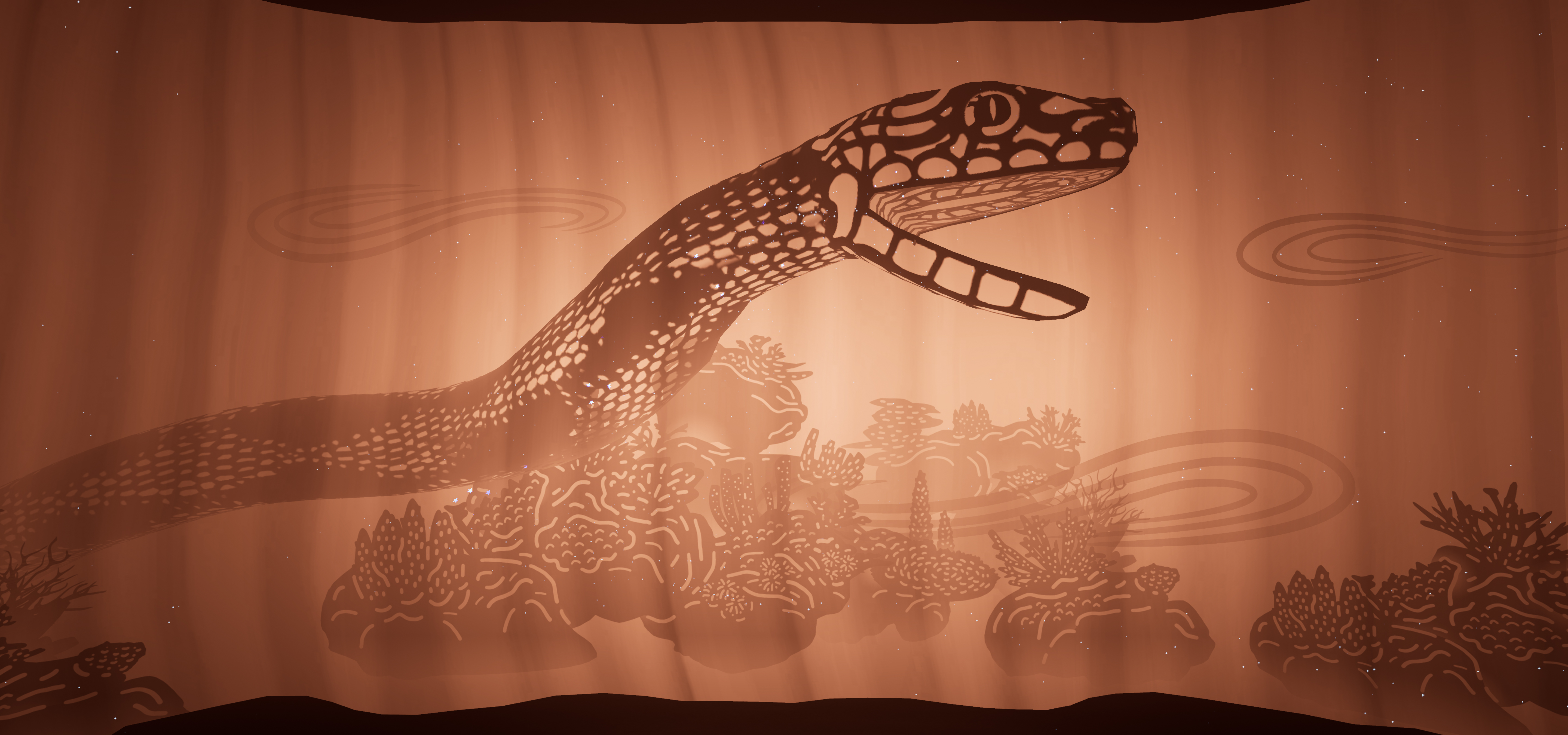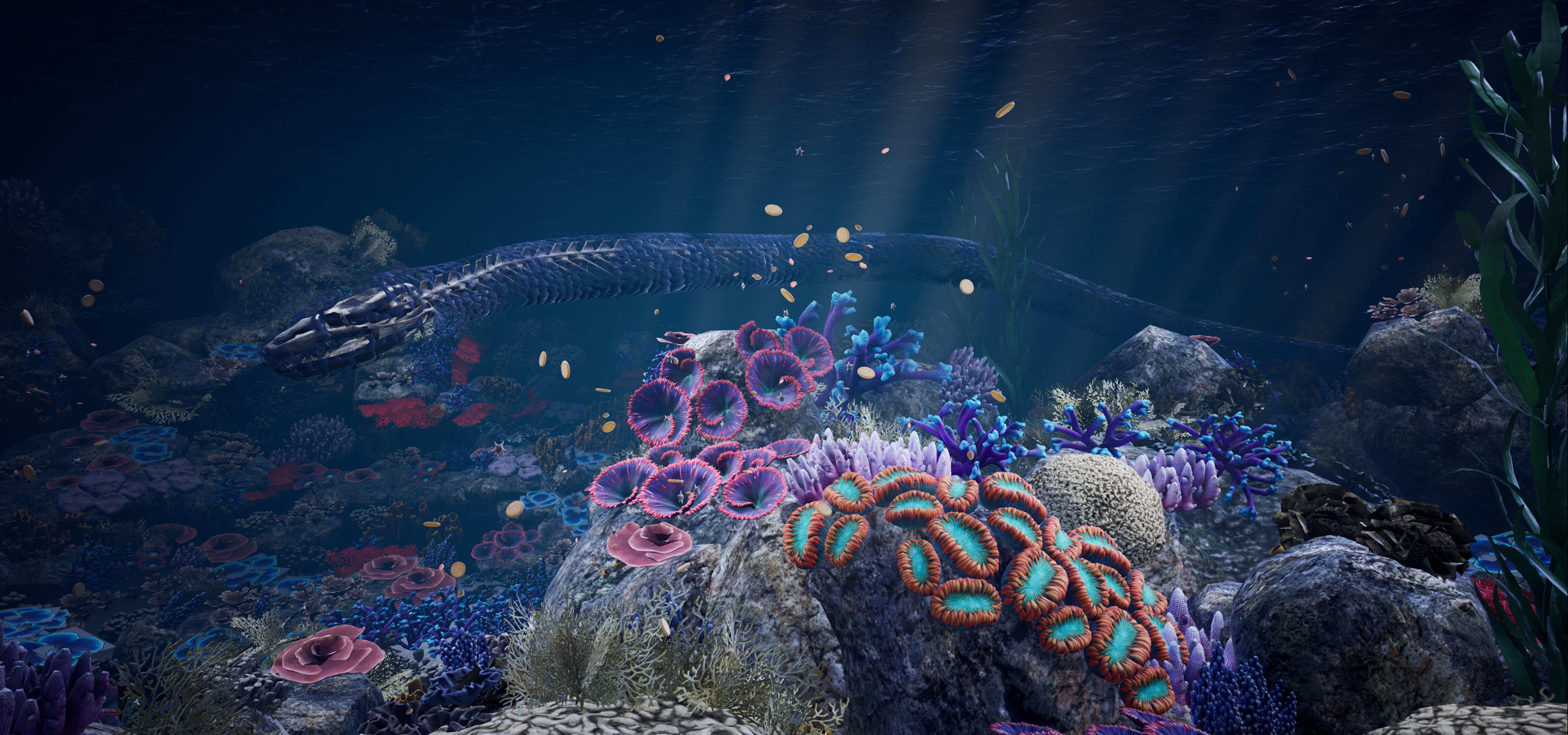The experience is divided into three parts: the legend, the underwater forest and the exploration of the Earth’s ancient geological memory. All throughout the experience and along with the foraminifera, you witness signs of the many threats to the marine and coral microorganisms, embodied by a sea serpent symbolizing the acidification of the oceans.