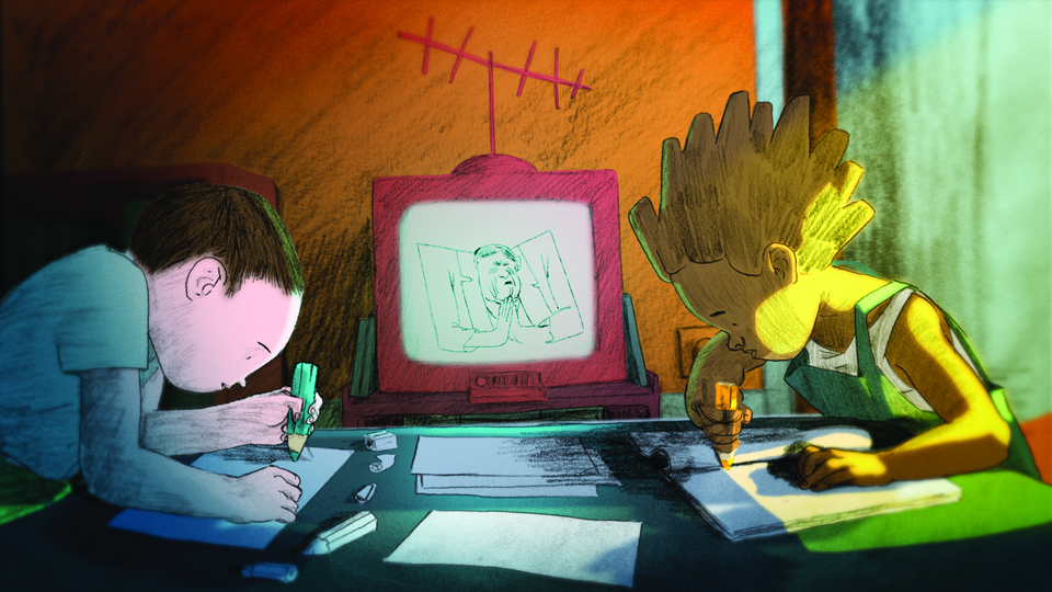 Two children get to know each other while drawing. Nevermind seditious discourses: despite differences, drawings forge ties.