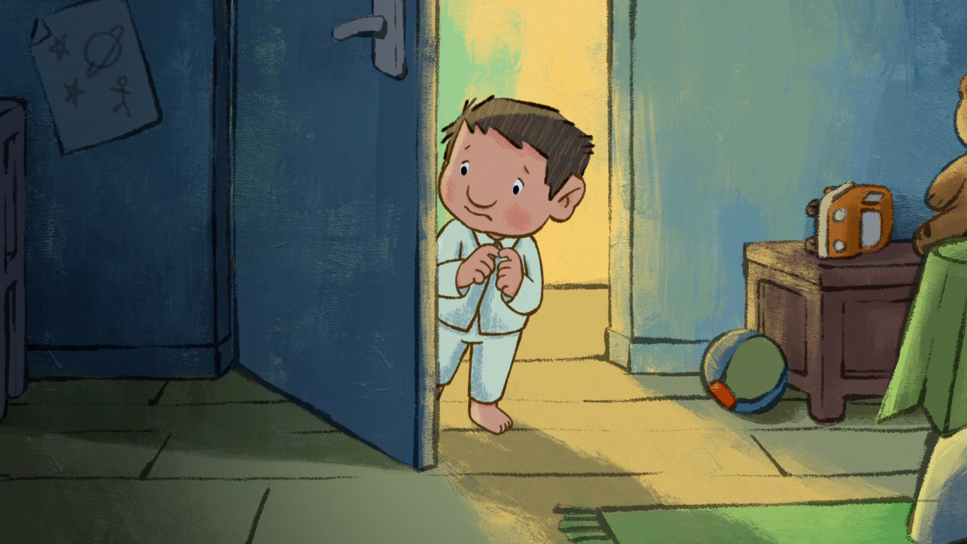 Robert does not like going to bed as he thinks there are monsters in his room, hiding in thedark. His mother leaves the landing light on and his door ajar. But that does not stop the little boy’s imagination from conjuring up his deepest fears! Fortunately, he has his teddy bear to help him.