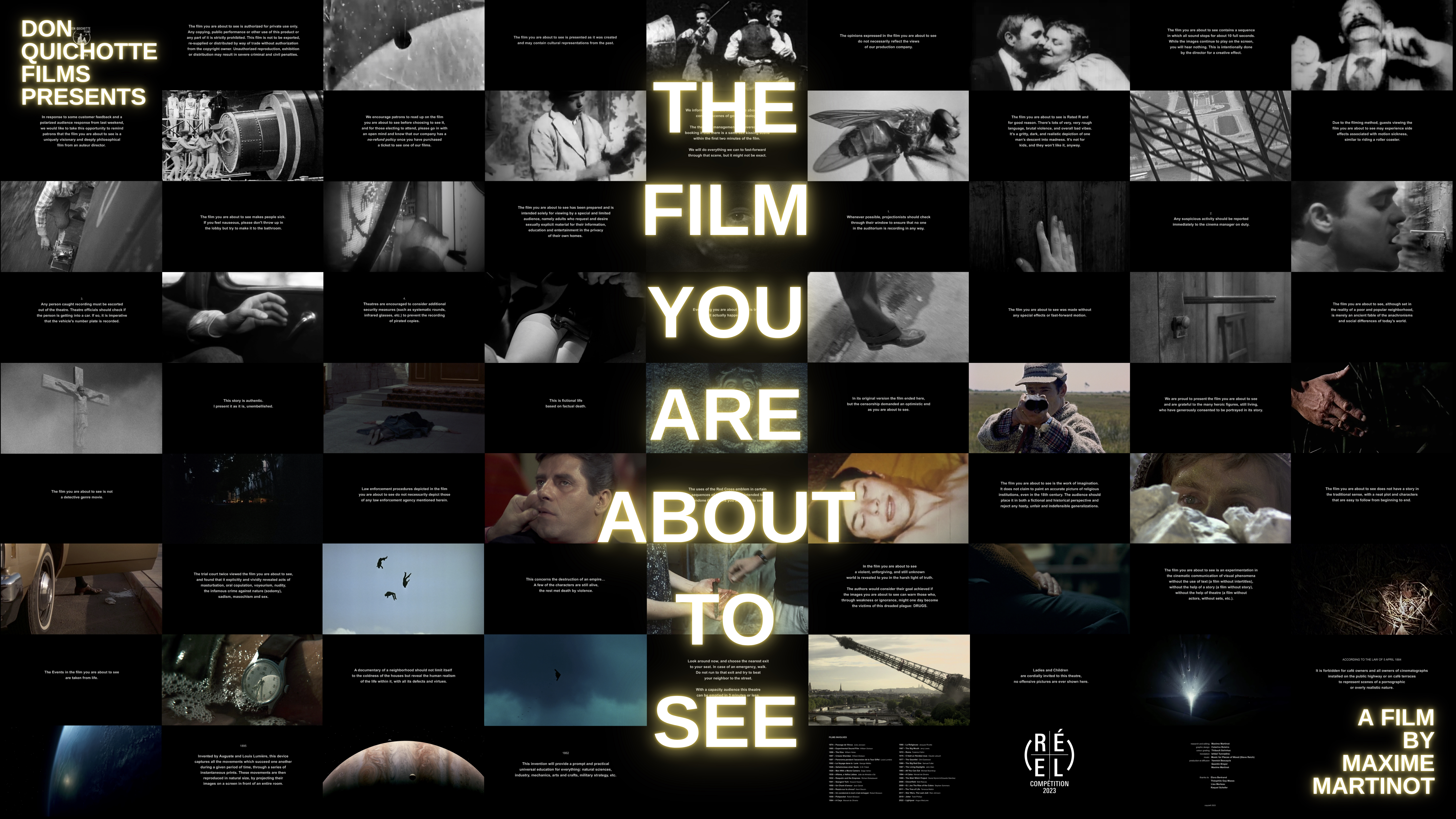 Please note that the film you are about to see is taken from real material of film history, namely the disclaimers and warnings that frame the existence of many films. However, any collusion between art and industry, any conflict of interest between freedom of creation and the law, or any hint of moralism on the life of images, would be purely incidental and unintentional.